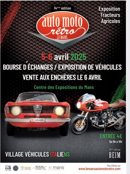 Nous commencerons par exposer des véhicules italiens lors du salon Auto Moto Rétro Le Mans du Vendredi 04 avril après-midi au Dimanche 06 Avril fin d’après-midi.